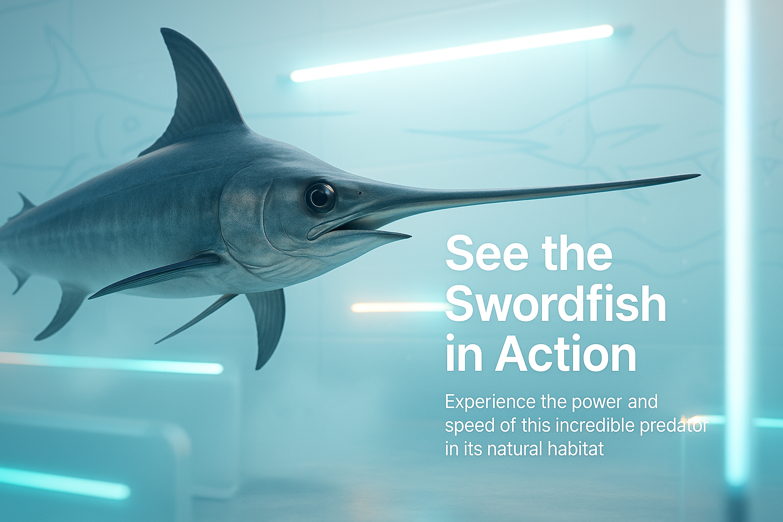 /Collection: /by davooda/Type: PNG/A striking 3D render of a swordfish showcased in a contemporary exhibit environment, highlighting its natural habitat and predatory nature, ideal for educational or promotional use.