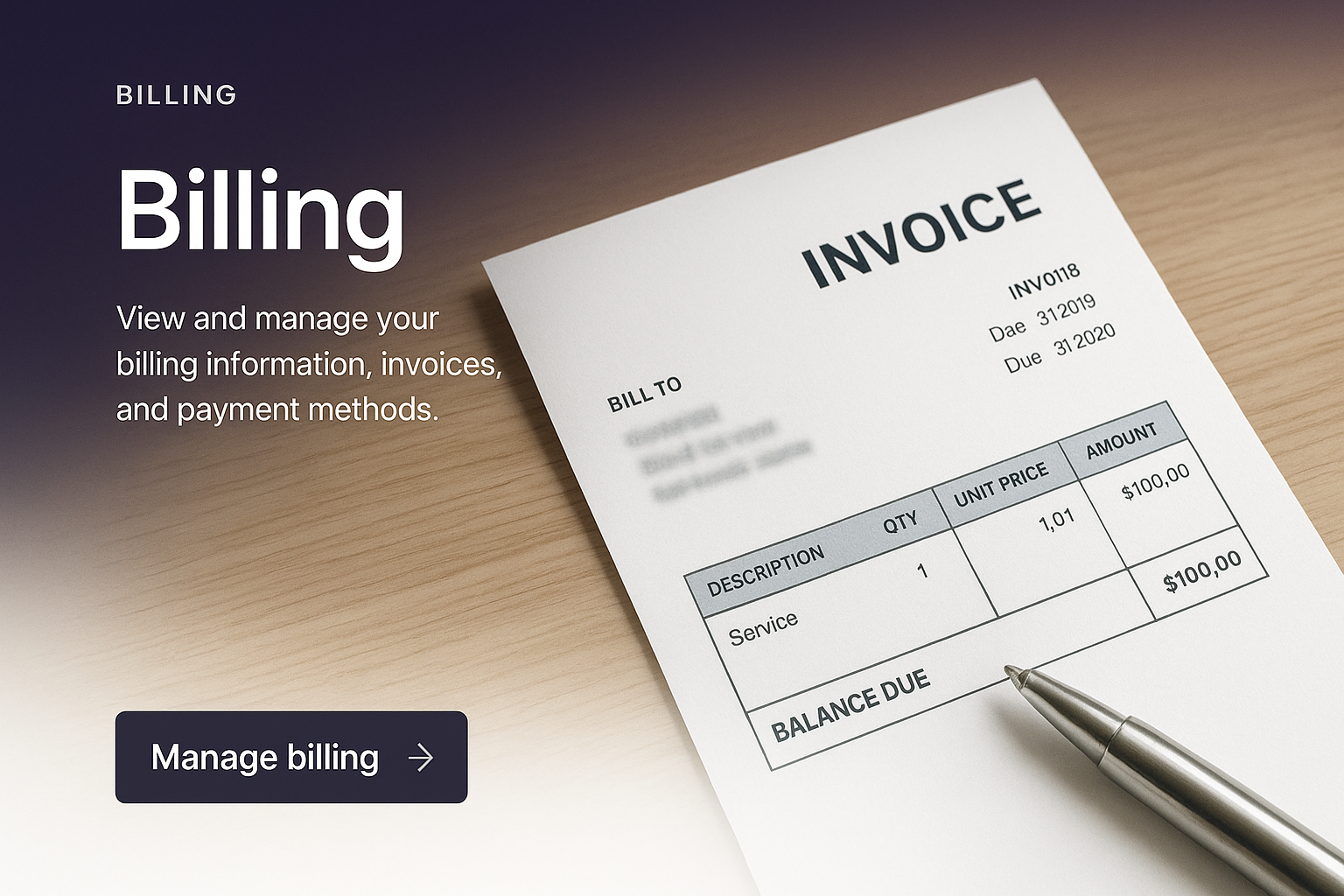 A stylish web layout featuring a billing invoice with clear text elements, a gradient background, and a prominent action button for managing billing.