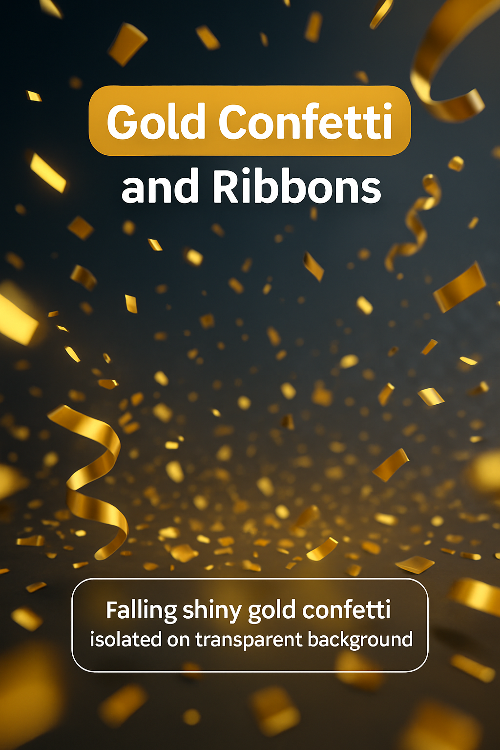 /Collection: /by davooda/Type: PNG/This image features shiny gold confetti and ribbons falling against a transparent background, ideal for celebrations or festive occasions. It has a vibrant, celebratory style.