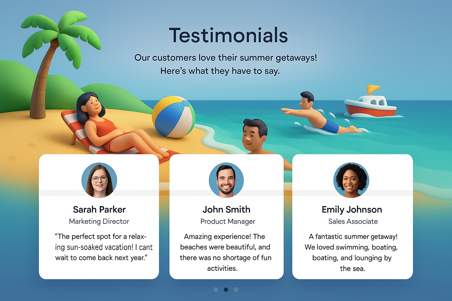 A vibrant testimonials section featuring three individuals sharing their summer activity experiences, with a beach background and playful elements.