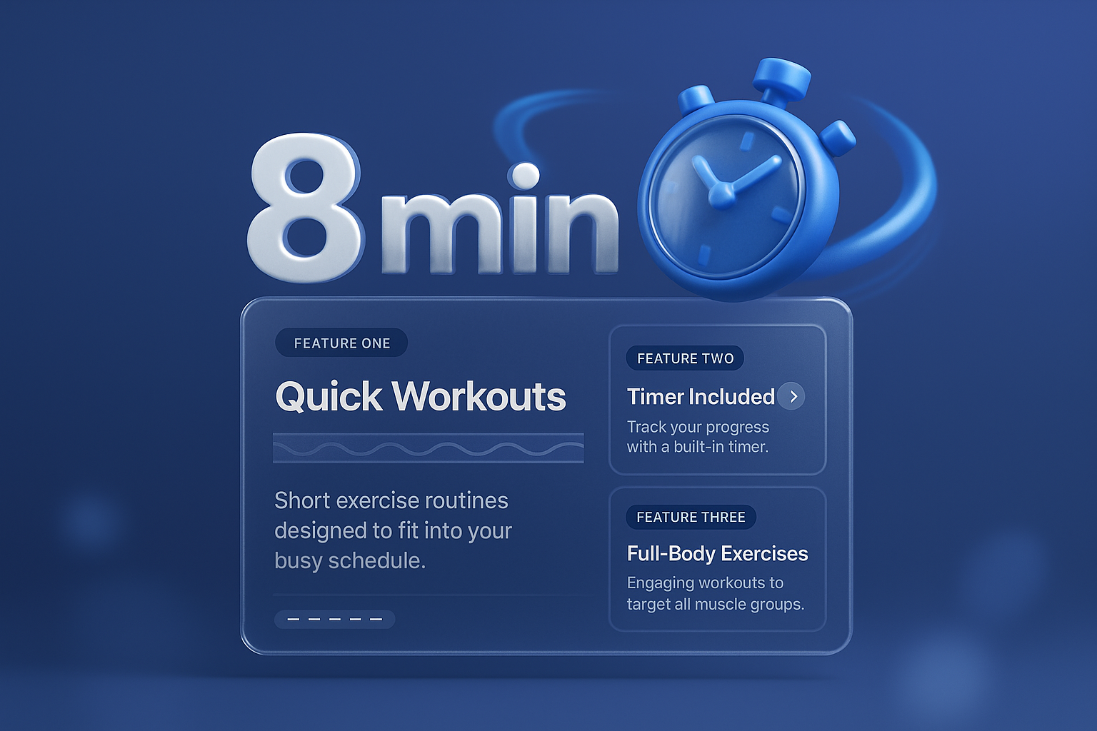 /Collection: /by davooda/Type: PNG/A dynamic 3D illustration featuring '8 min' text and a timer icon. It includes blocks for quick workouts with a smooth gradient background and layered composition.