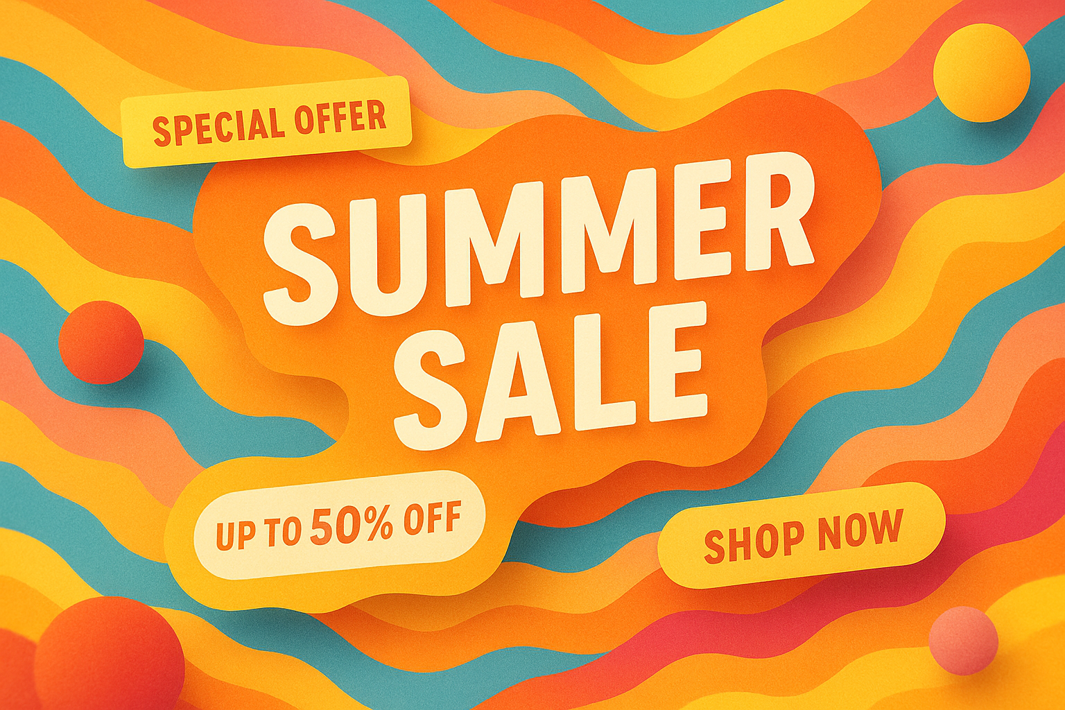 Colorful promotional banner featuring a summer sale announcement with a dynamic wave design, ideal for e-commerce and seasonal marketing.