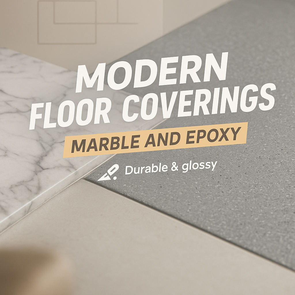 /Collection: /by davooda/Type: PNG/Promotional image showcasing modern floor coverings, featuring marble and epoxy surfaces. The design emphasizes durability and glossiness, appealing to homeowners and interior designers.