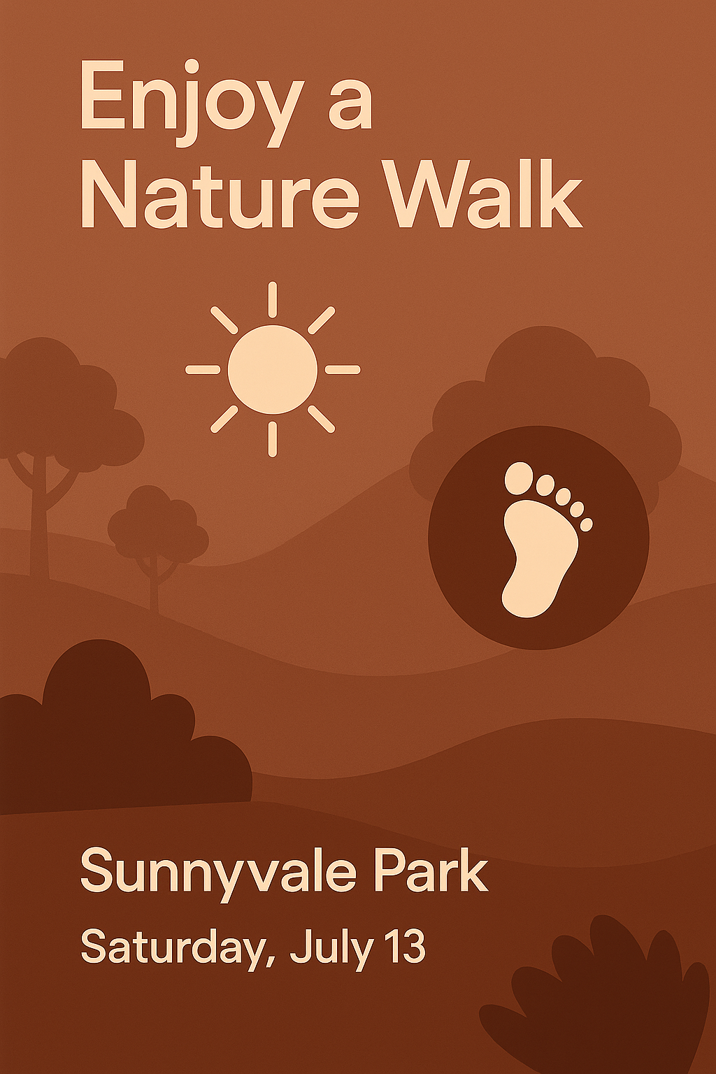 A minimalist event poster promoting a nature walk featuring simple graphics and warm colors, ideal for community engagement and outdoor events.