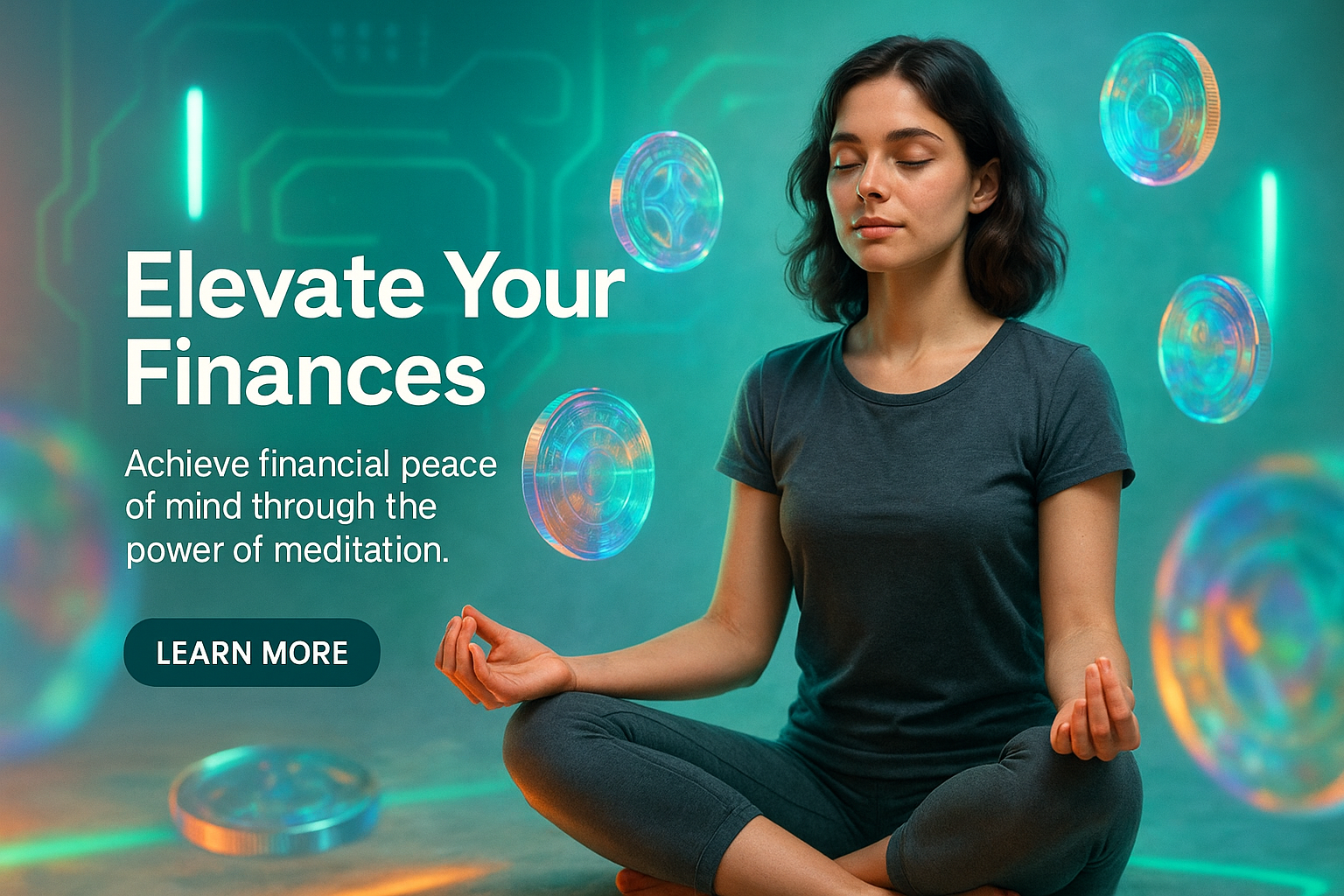A vibrant promotional graphic featuring a woman meditating amidst floating holographic coins, symbolizing the connection between mindfulness and financial peace, ideal for wellness and finance campaigns.