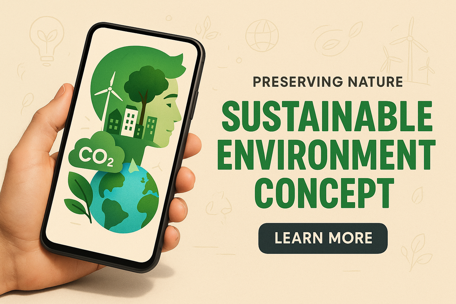 /Collection: /by davooda/Type: PNG/The image showcases a smartphone displaying a vibrant design focused on sustainability, featuring elements like wind turbines and a globe. The layout emphasizes eco-friendliness with bold typography and a balanced composition.