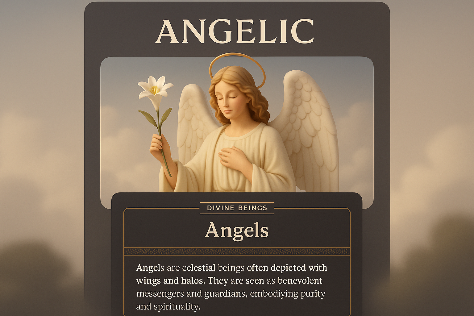 /Collection: /by davooda/Type: PNG/A 3D illustration of an angel holding a flower, integrated with stylish text blocks. The design features a gradient background and a dark panel for text, creating a serene and spiritual atmosphere.