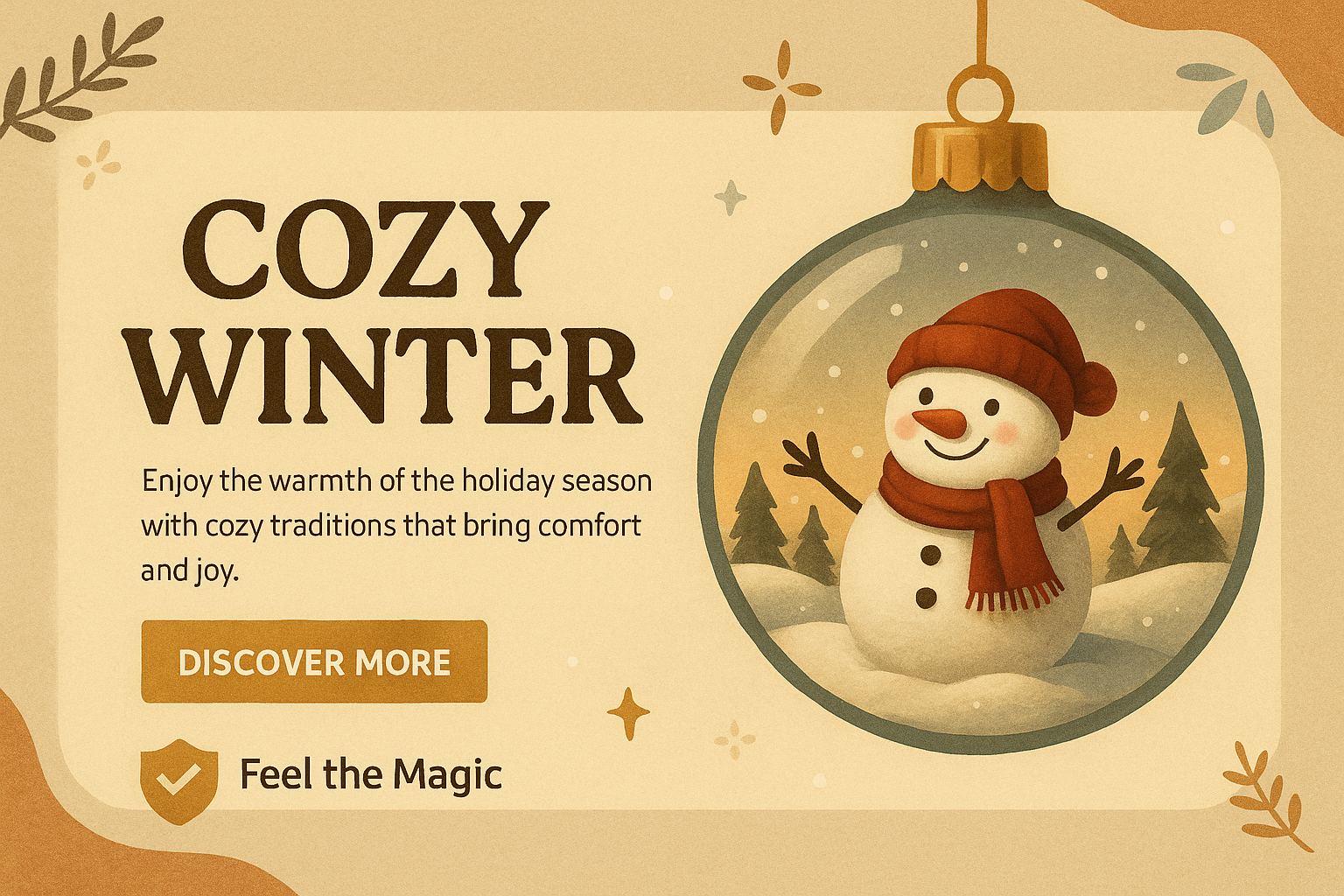 A cozy winter-themed design featuring a cheerful snowman inside a Christmas bauble. The background has soft colors with decorative elements, enhancing the festive atmosphere.