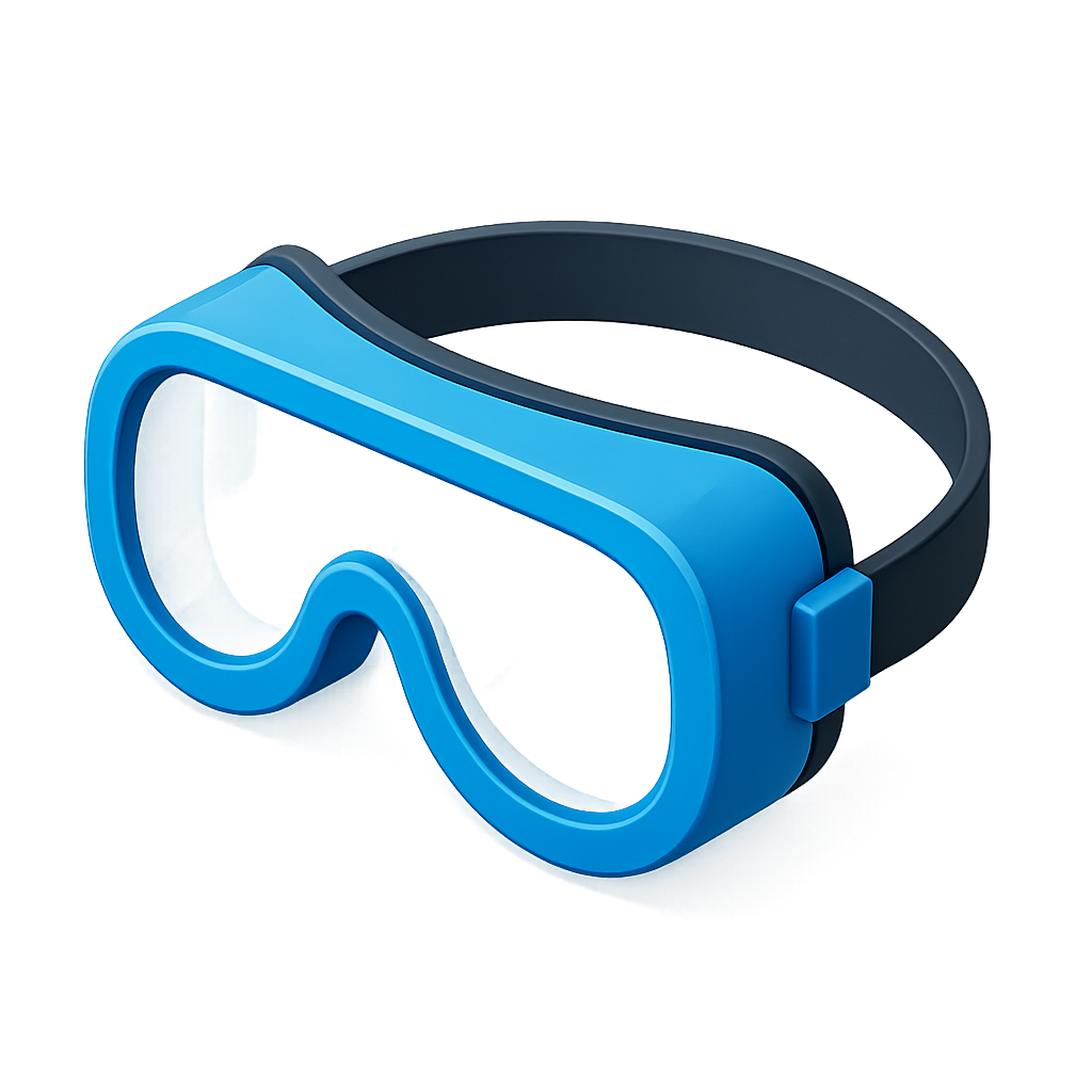 A modern design of blue safety goggles featuring a strap, depicted in a three-quarter view with a 3D isometric feel. The transparent background enhances its sleek appearance.