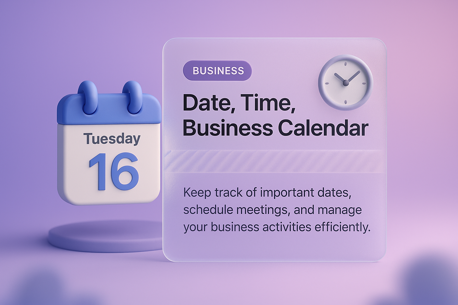 A 3D illustration featuring a business calendar block with a clock, displaying the date and time. The design includes a stylish gradient background and subtle elements for depth.