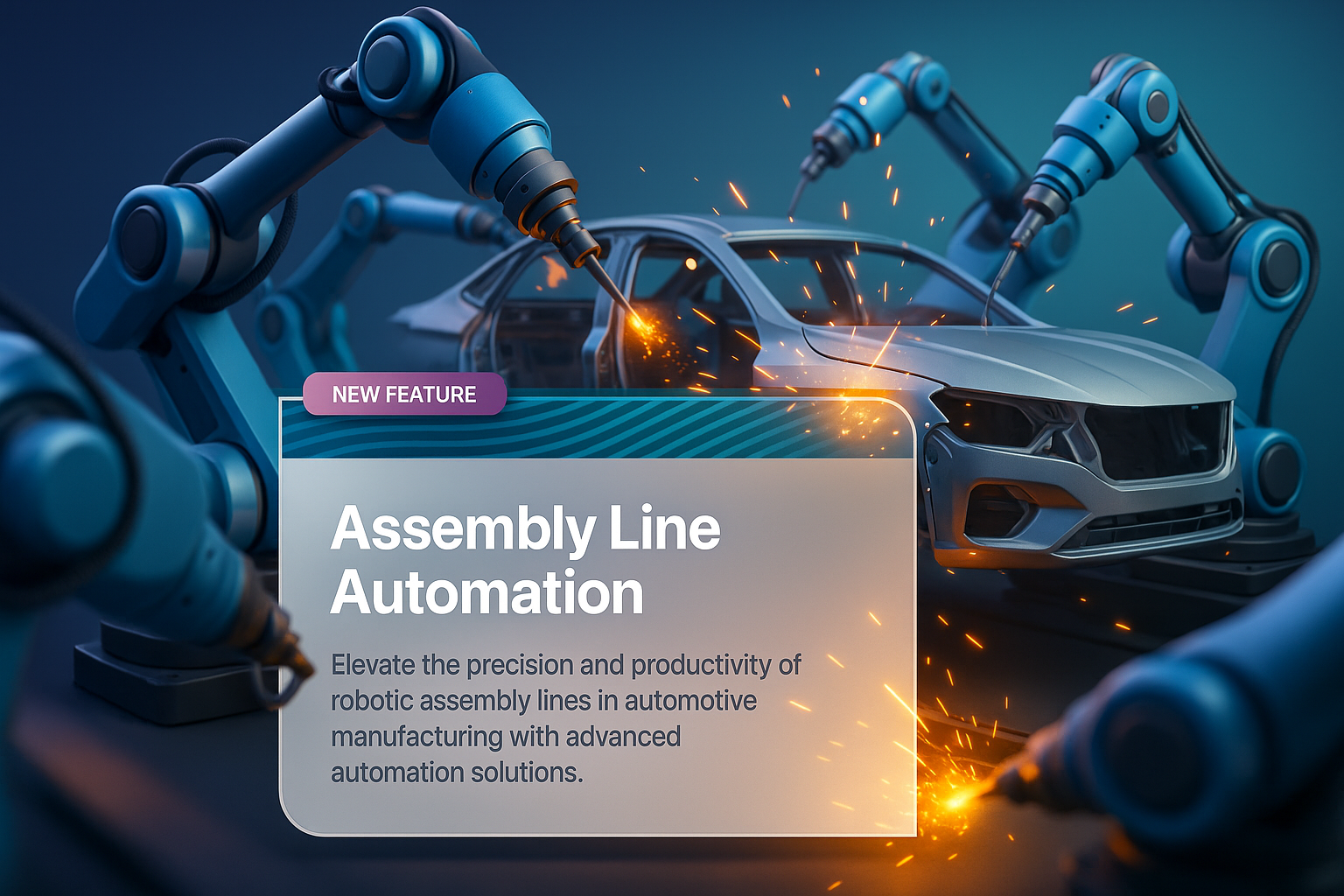 /Collection: /by davooda/Type: PNG/A dynamic 3D illustration of a robotic assembly line in an automotive factory. Featuring robotic arms working on a car model with sparks flying, highlighted by a modern feature block.