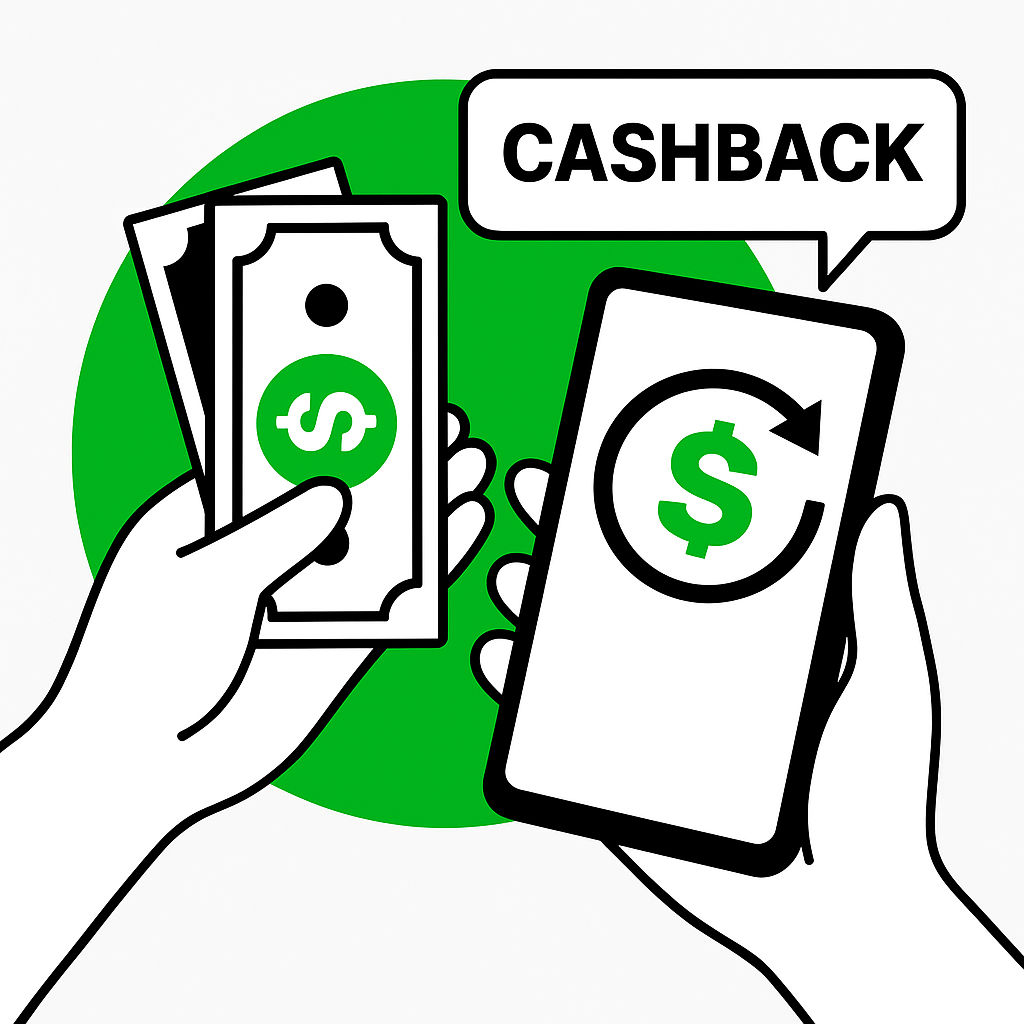 /Collection: /by davooda/Type: PNG/Stylized illustration depicting the concept of cashback, featuring hands holding cash and a smartphone, designed for financial promotions or educational content.