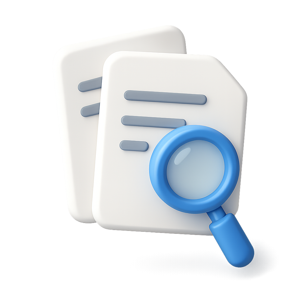 A 3D icon featuring two white documents and a blue magnifying glass, designed in an isometric style with a transparent background, emphasizing document inspection.