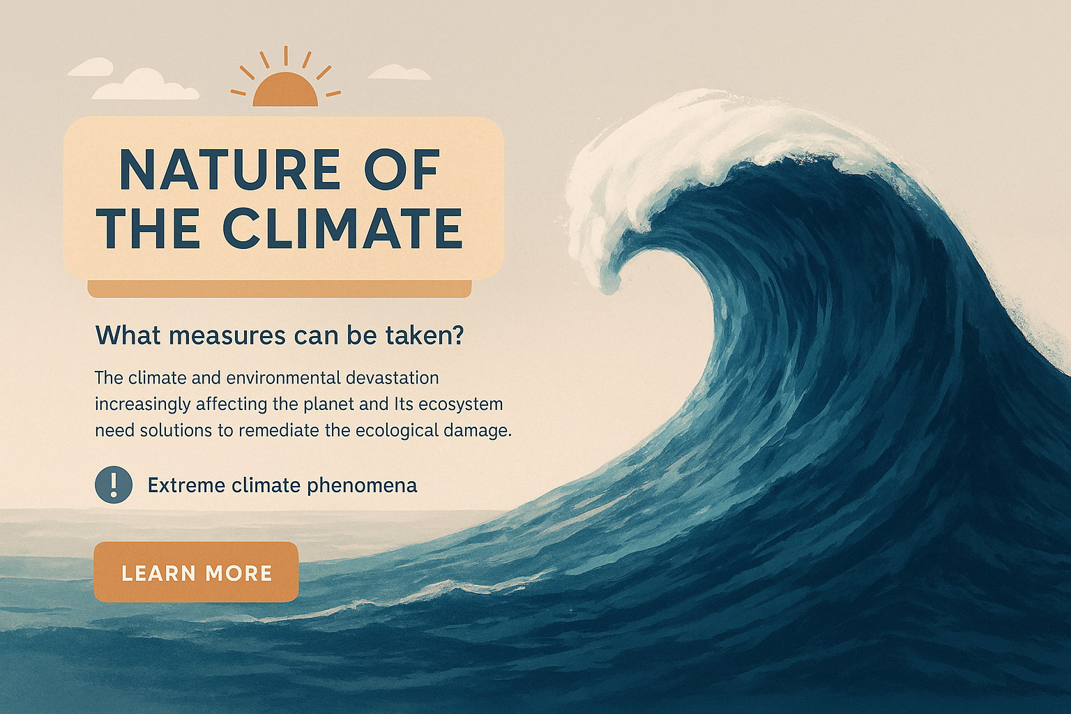 A large, stormy sea wave depicted in deep blue colors, set against a minimalist white background. The design emphasizes climate-related themes with clean text elements.