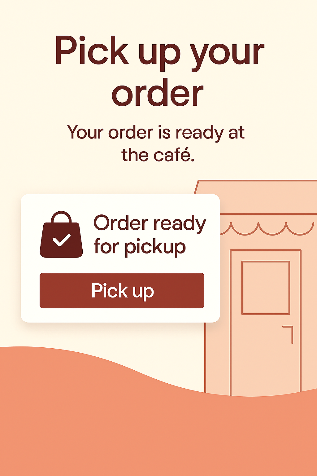 Digital notification graphic indicating that a café order is ready for pickup, featuring a minimalistic design with warm colors and simple illustrations, ideal for app or website use.