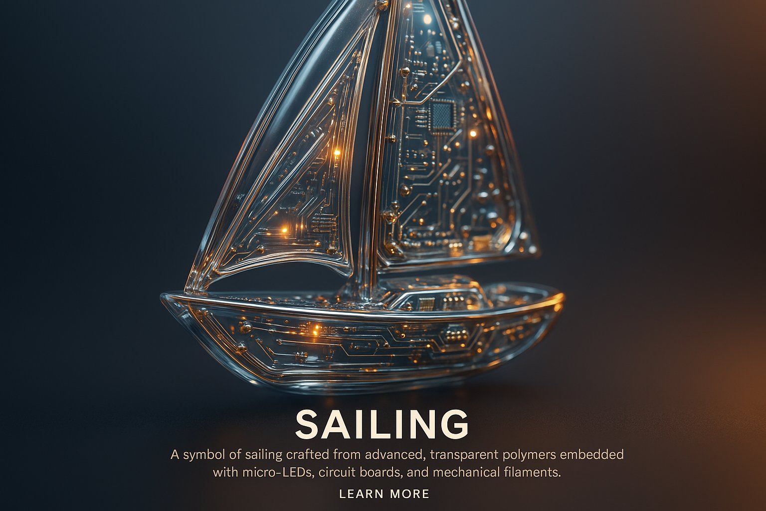 /Collection: /by davooda/Type: PNG/An intricate close-up of a sailing sculpture made from transparent polymers, showcasing glowing micro-LEDs and circuit details. The piece emphasizes high-tech aesthetics with metallic reflections.