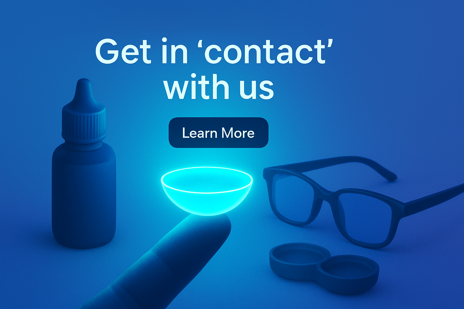 A glowing aquamarine contact lens rests on a finger amidst a setting of glasses and a bottle. The soft fluorescence illuminates the scene, creating a serene atmosphere.