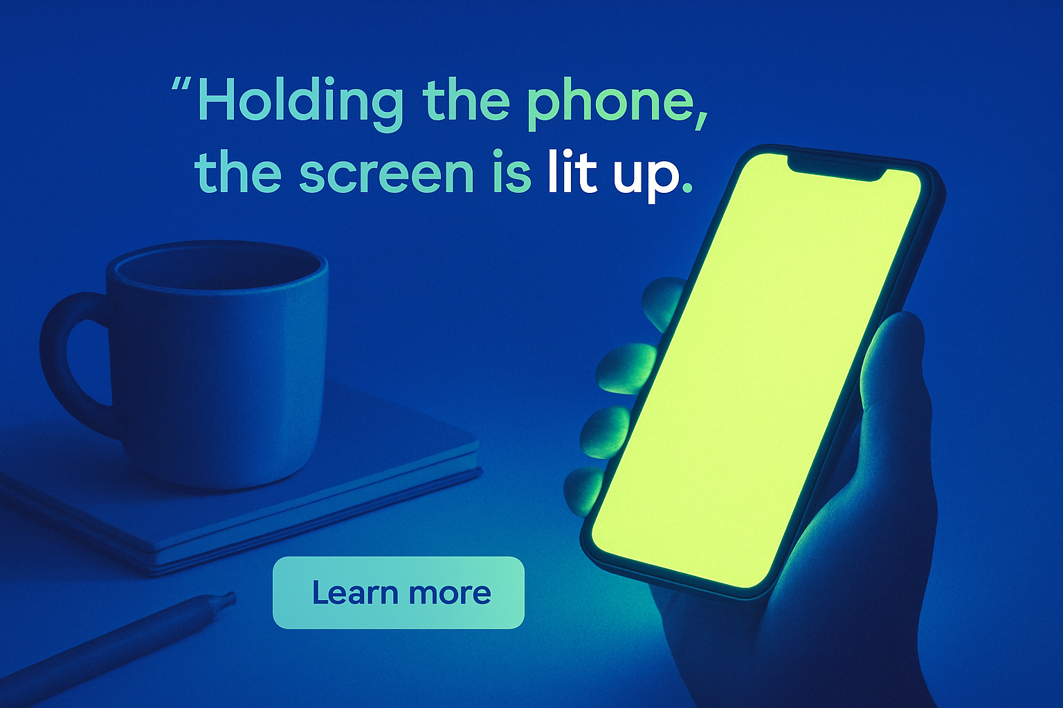 A hand holds a phone with a bright, glowing screen in a shadowy setting, complemented by a coffee mug and a pen. The background is a solid blue, enhancing the glowing elements.
