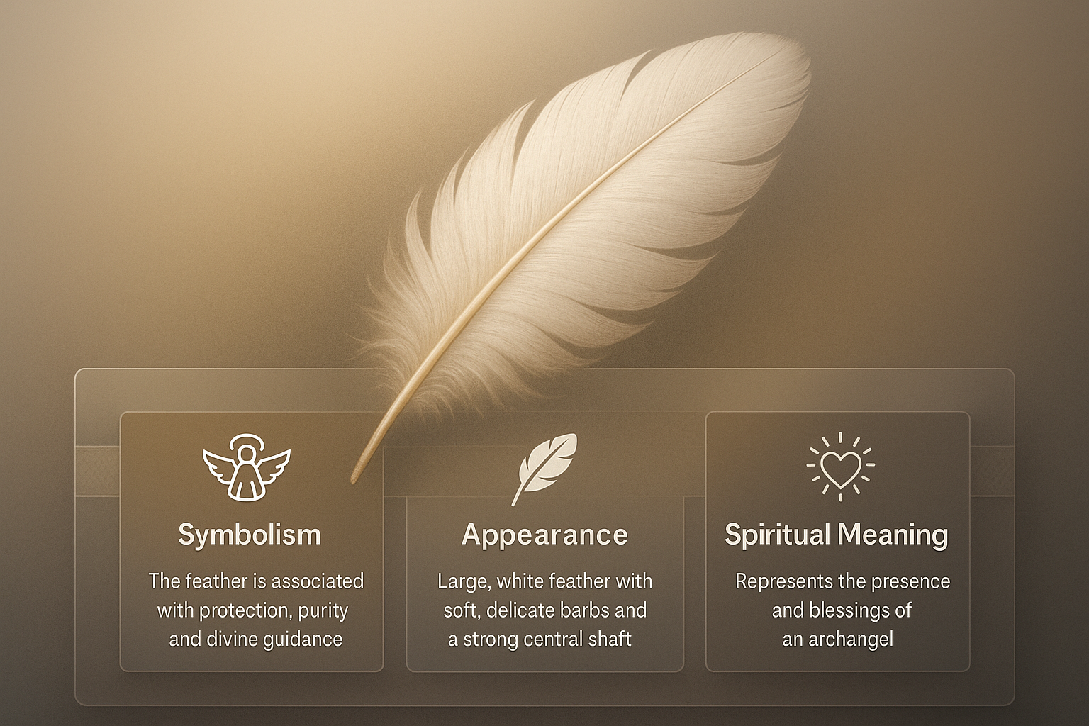 A beautifully designed archangel feather illustration, featuring a soft gradient background. The layout includes three informative blocks highlighting symbolism, appearance, and spiritual meaning.