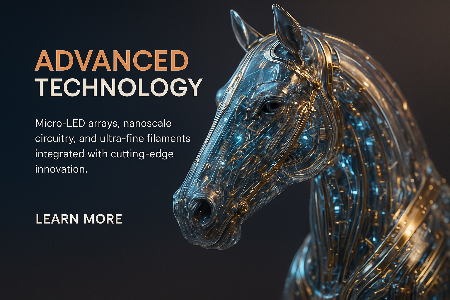 /Collection: /by davooda/Type: PNG/A stunning hyperrealistic close-up of a horse sculpted from glass-like polymers, showcasing glowing micro-LEDs and intricate metallic components, all enhanced by stylish lighting.