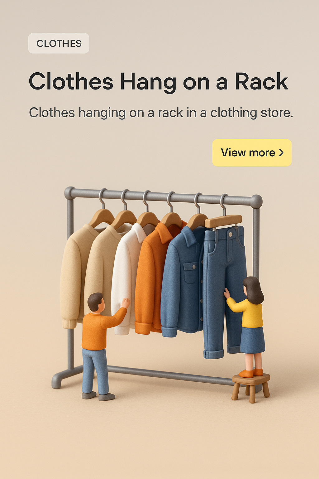 A delightful 3D illustration showcasing a clothing rack filled with garments. Two small figures interact with the clothes in a store setting, emphasizing a whimsical, miniature world.