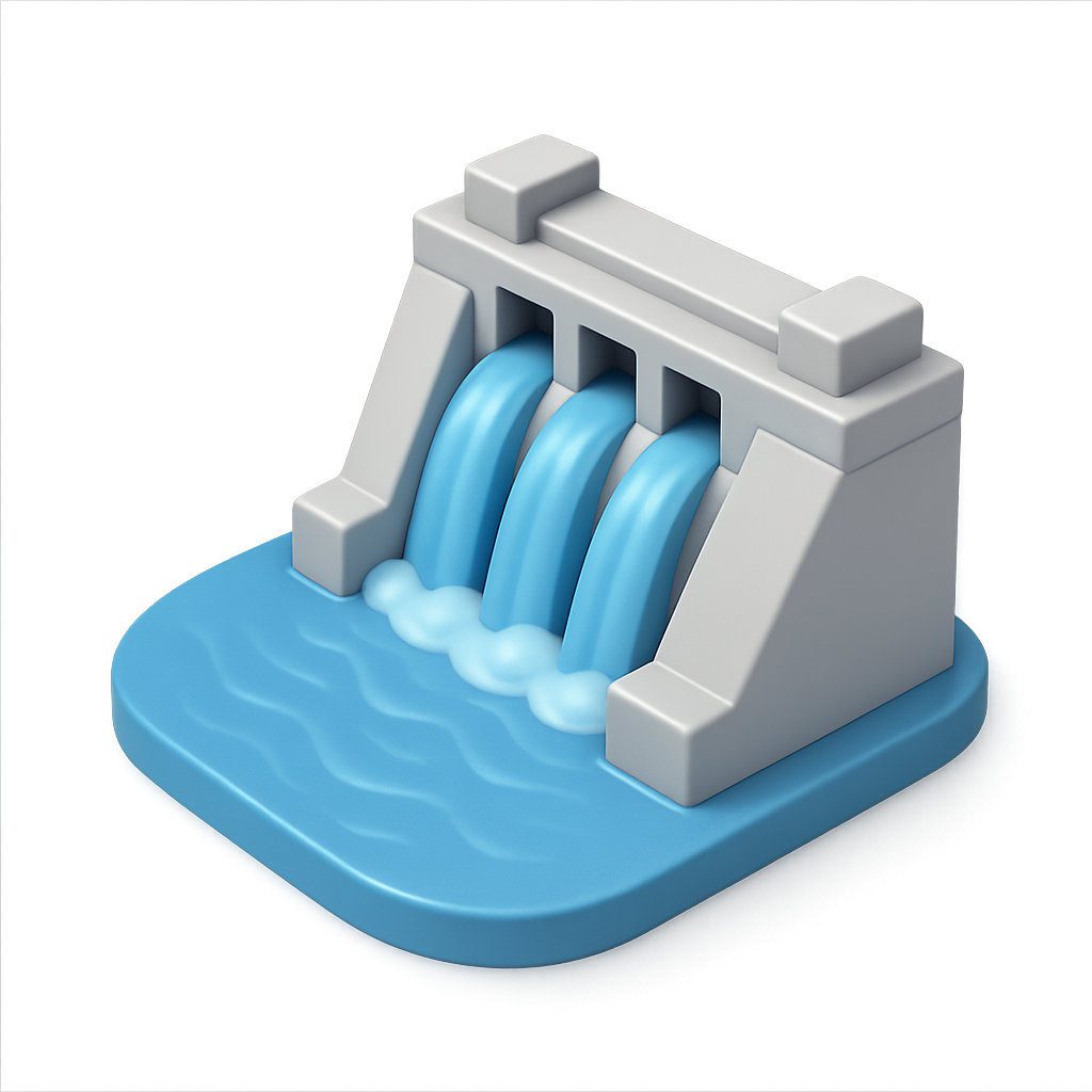 /Collection: /by davooda/Type: PNG/A three-dimensional icon depicting a barrage with flowing water. The design features a light-colored structure with four streams of blue water, set against a transparent background, showcasing a volumetric and isometric style.