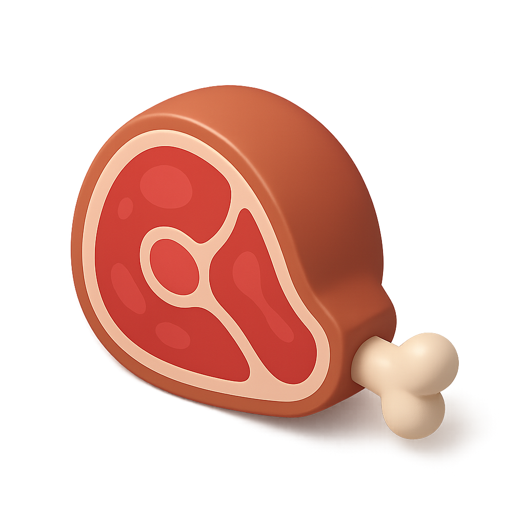 A colorful, stylized 3D icon of a meat cut, presented from a three-quarter view. The design features a smooth, rounded shape with a bone and details that enhance its volumetric appearance.