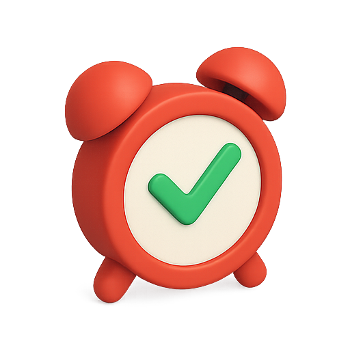 A vibrant 3D rendering of a red alarm clock featuring a green checkmark, symbolizing completion or readiness. Ideal for apps and digital interfaces.