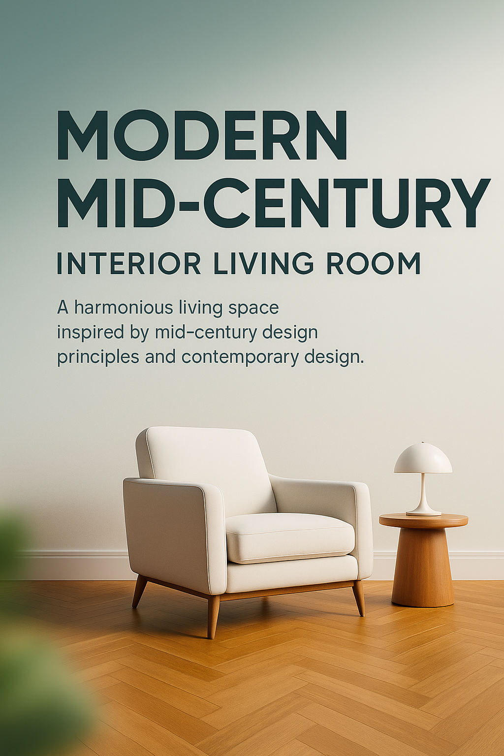 /Collection: /by davooda/Type: PNG/A stylish living room showcasing mid-century design with a white armchair, wooden flooring, and a minimalist aesthetic. The background features a smooth gradient, enhancing the overall elegance.