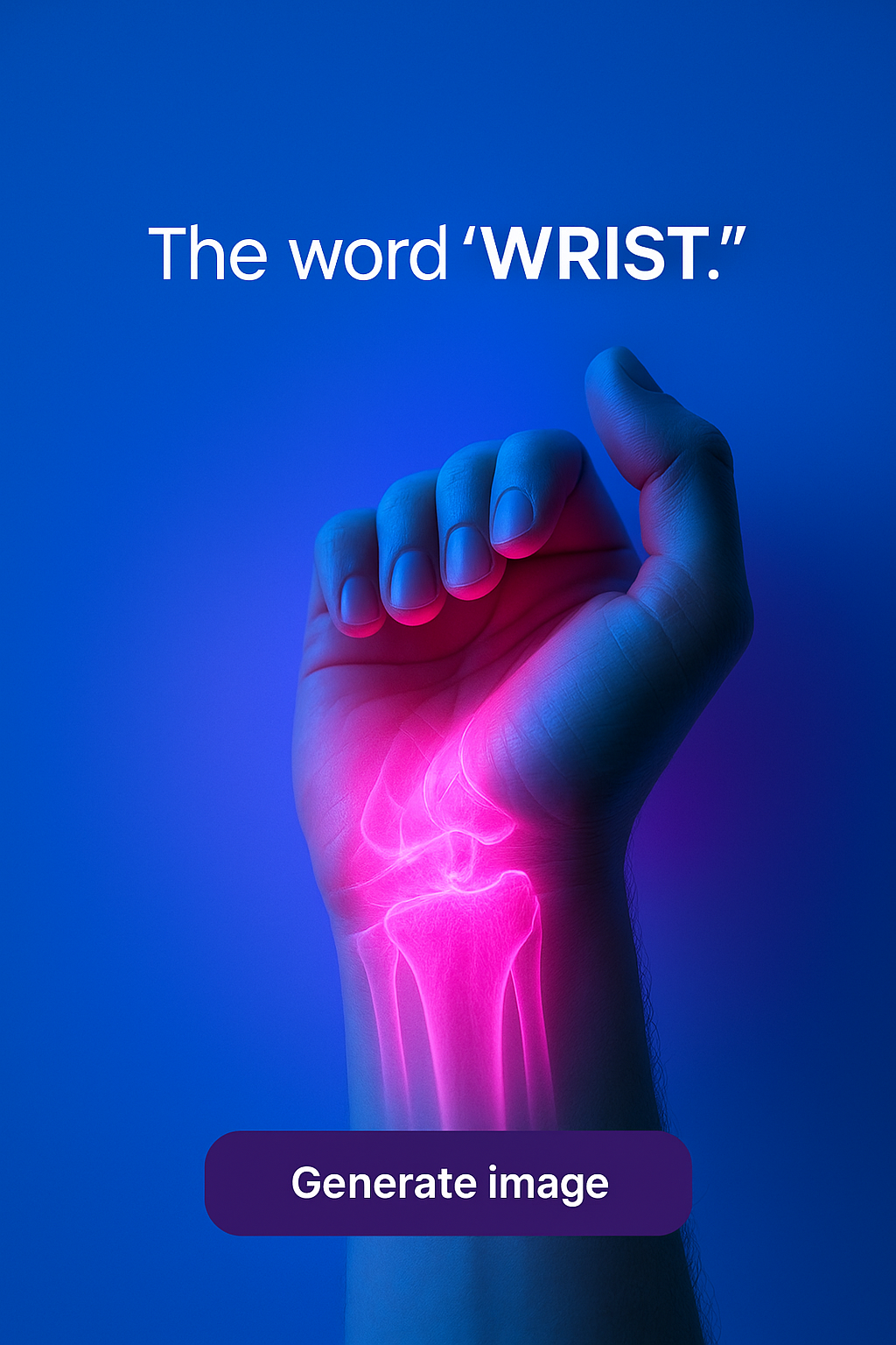 /Collection: /by davooda/Type: PNG/A striking illustration of a hand showcasing the word 'Wrist' in glowing neon pink. The vibrant glow illuminates the surroundings with cool shades, set against a solid blue background.