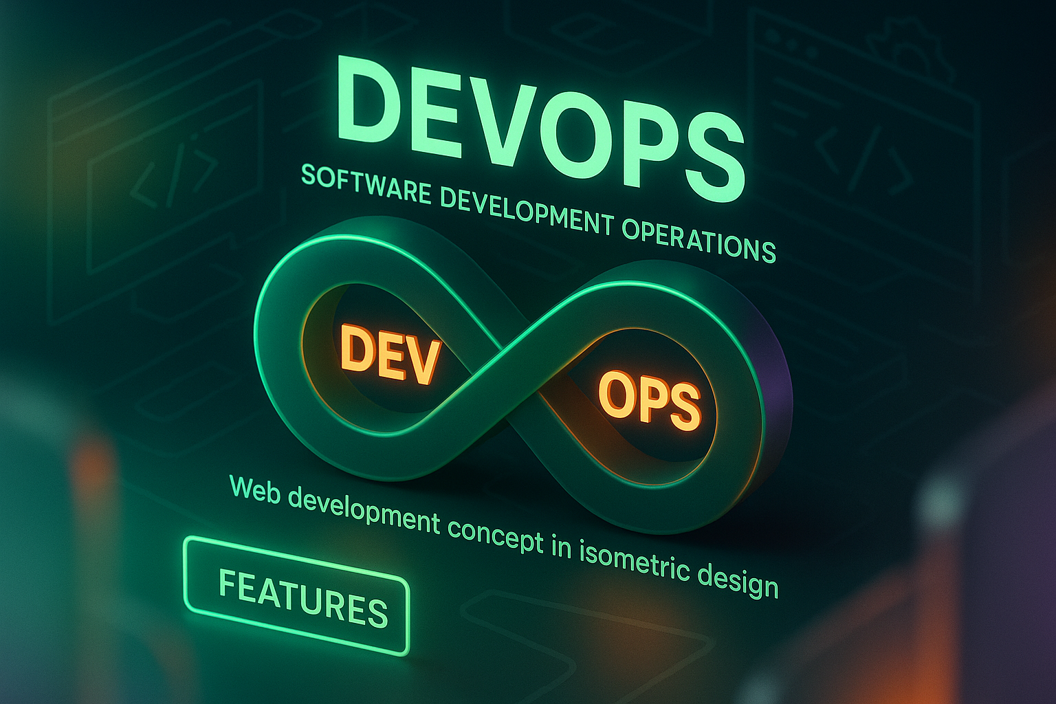 /Collection: /by davooda/Type: PNG/A visually engaging isometric graphic representing DevOps, showcasing a modern design with neon colors and a tech-focused theme, suitable for web development presentations.