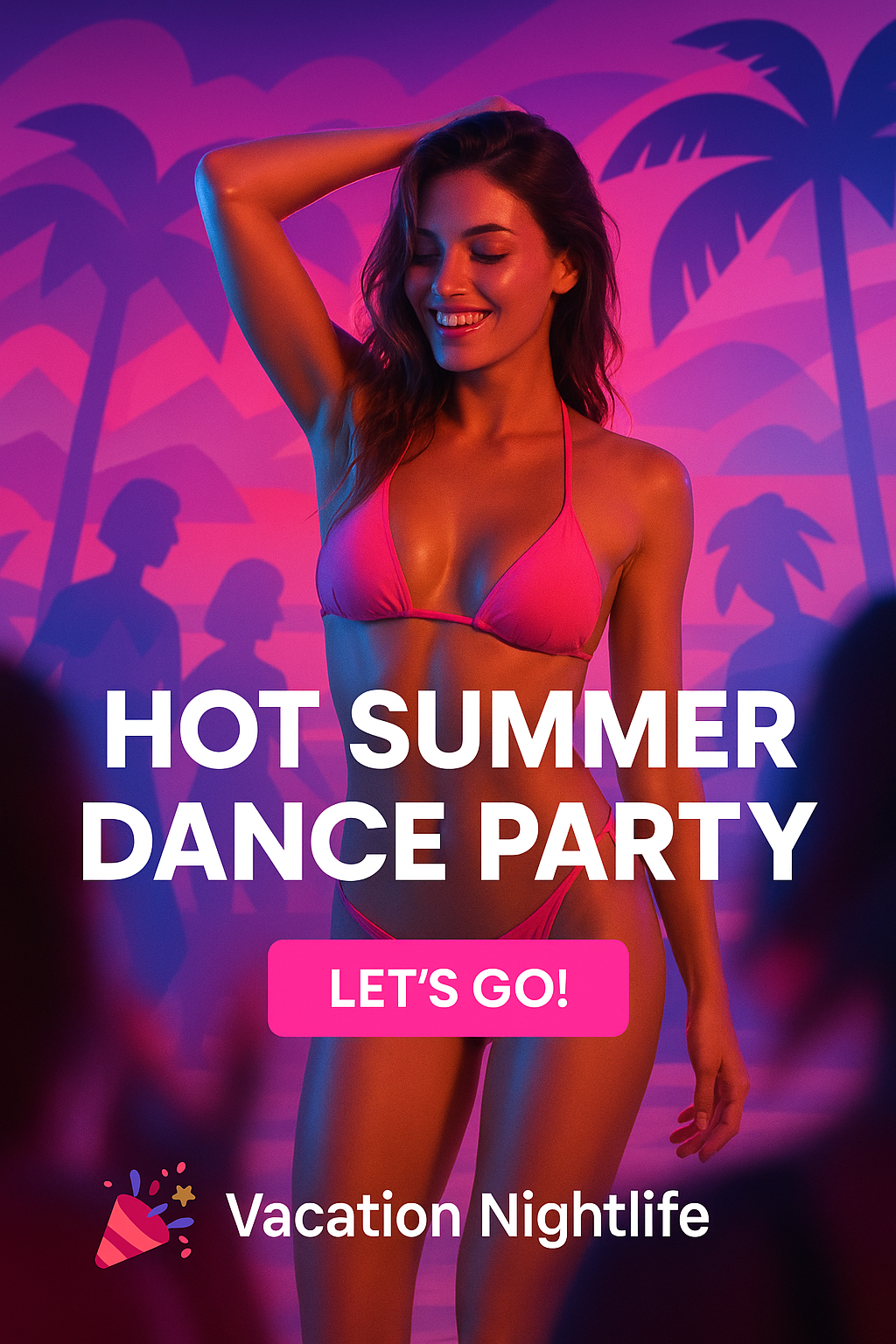 Dynamic promotional graphic for a summer dance party featuring a vibrant color scheme and an energetic atmosphere, ideal for social media and event marketing.