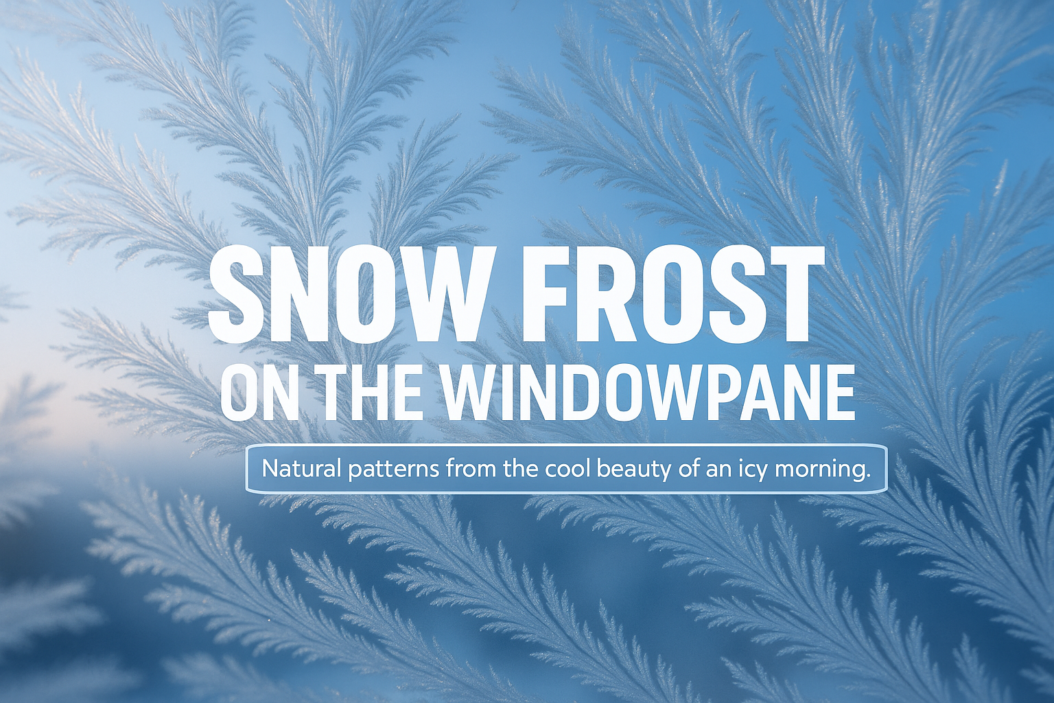 /Collection: /by davooda/Type: PNG/A stunning display of snow frost forming intricate patterns on a window pane, set against a soft, cool morning sky. The natural beauty captures the essence of winter mornings.