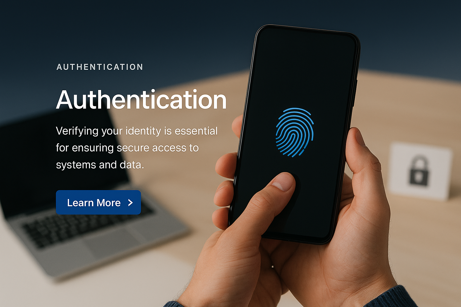 A modern web page layout showcasing authentication. Features a hand holding a smartphone with a fingerprint icon, alongside a secure lock symbol. Includes a clear call-to-action button.