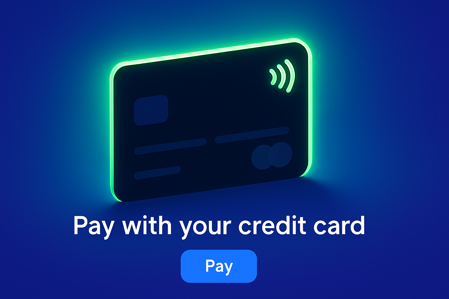 /Collection: /by davooda/Type: PNG/A modern vector design of a credit card illuminated with a glowing neon outline. The background features a solid blue color, enhancing the futuristic look. A call-to-action button invites users to pay.