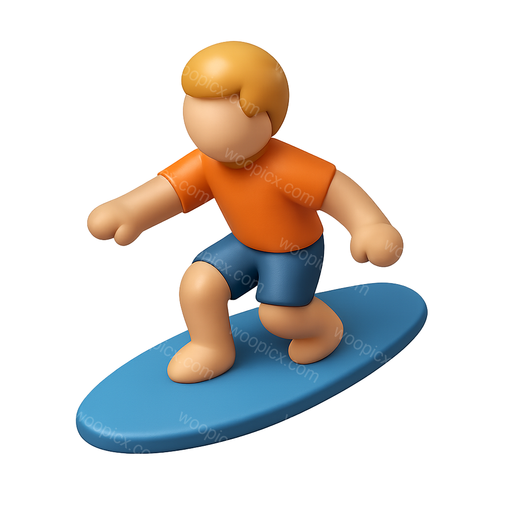 A vibrant 3D icon depicting a person riding a surfboard. The figure features a simplistic design with a blue surfboard and an orange shirt, set against a softly blurred background.