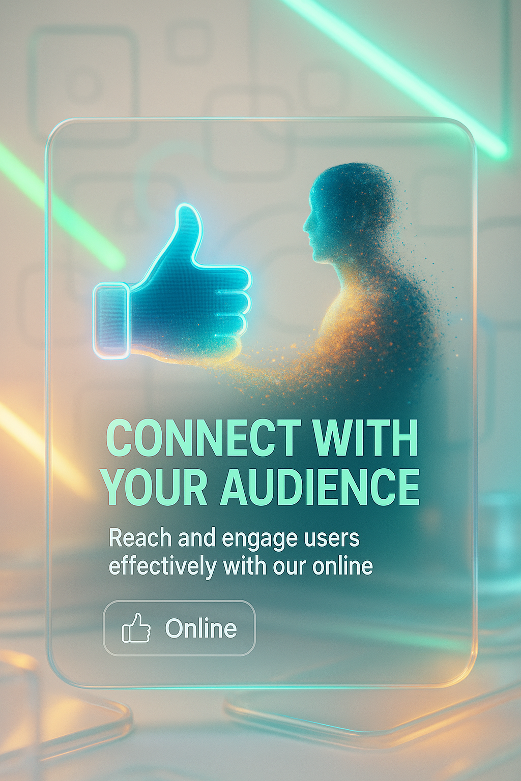 Modern promotional graphic focused on engaging online audiences, featuring a visually striking design with a glowing thumbs-up icon and a silhouette, ideal for digital marketing campaigns.
