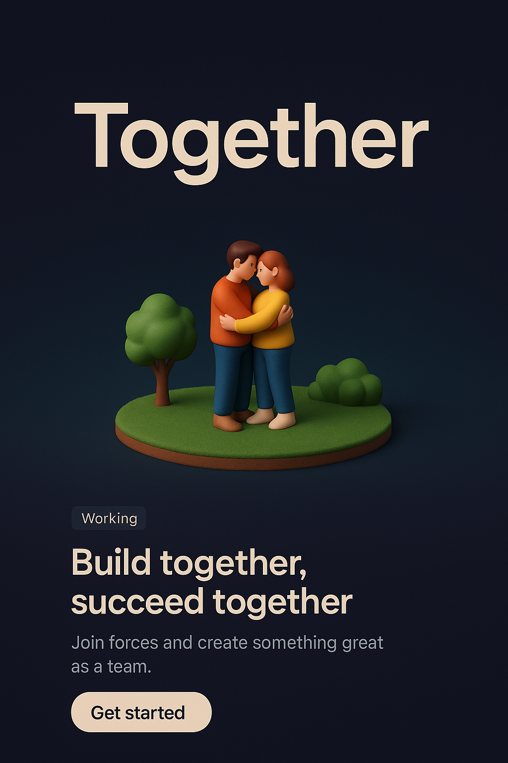 /Collection: /by davooda/Type: PNG/A zoomed-out 3D illustration featuring a couple embracing in a serene environment, surrounded by trees. The dark gradient background enhances the vibrant colors of the scene, emphasizing themes of unity and teamwork.