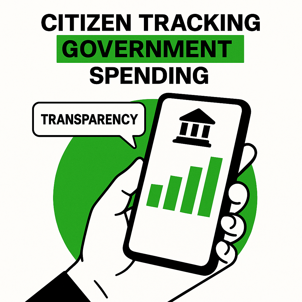 /Collection: /by davooda/Type: PNG/An informative infographic illustrating the concept of citizen tracking of government spending, featuring a hand holding a smartphone with graphs and a bank icon. Ideal for educational campaigns focused on transparency.