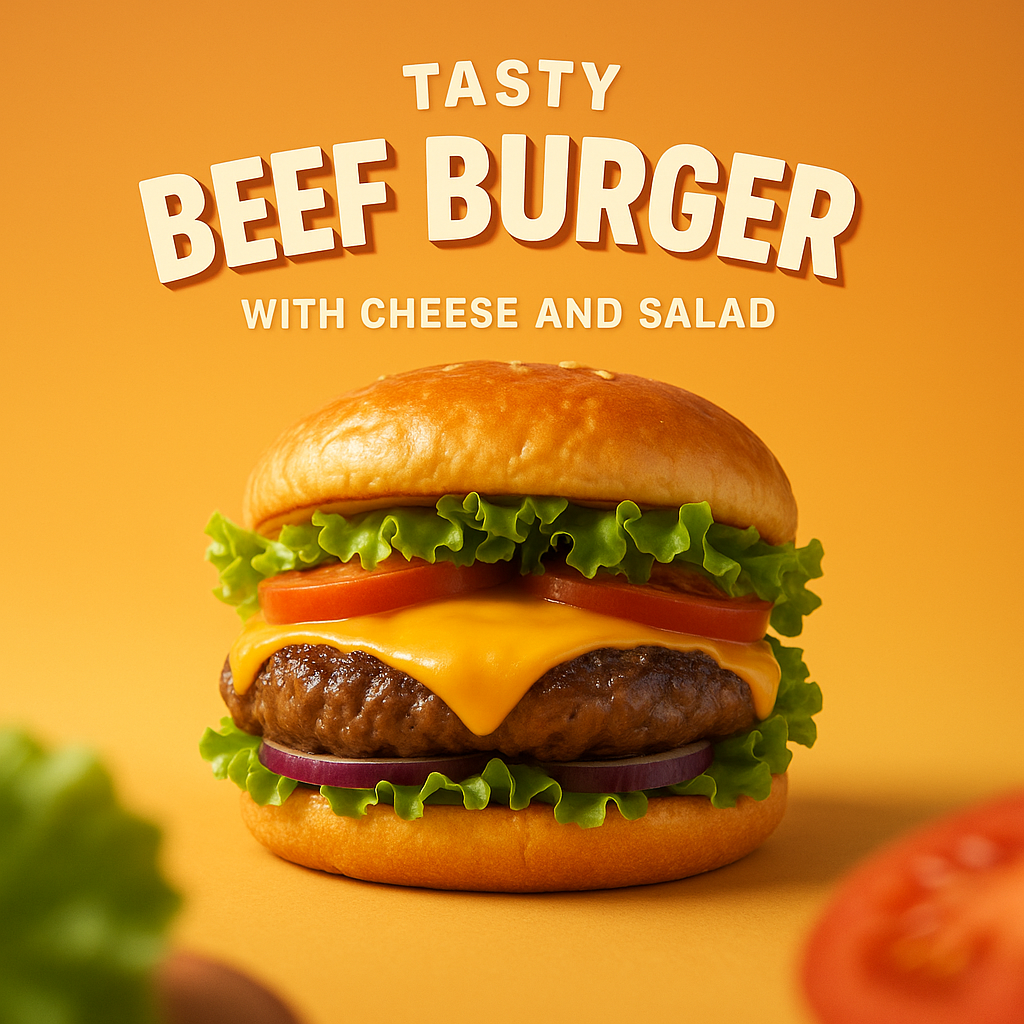 Delicious Beef Burger with Cheese and Salad on Vibrant Background