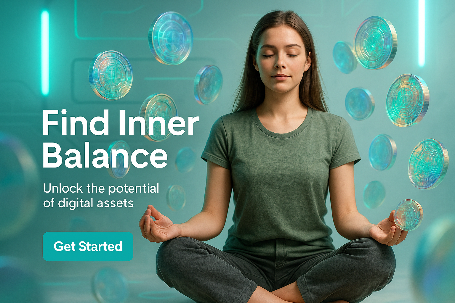 Engaging promotional image featuring a serene individual meditating amidst floating digital elements, aimed at promoting awareness of digital assets. Ideal for online marketing and educational platforms.