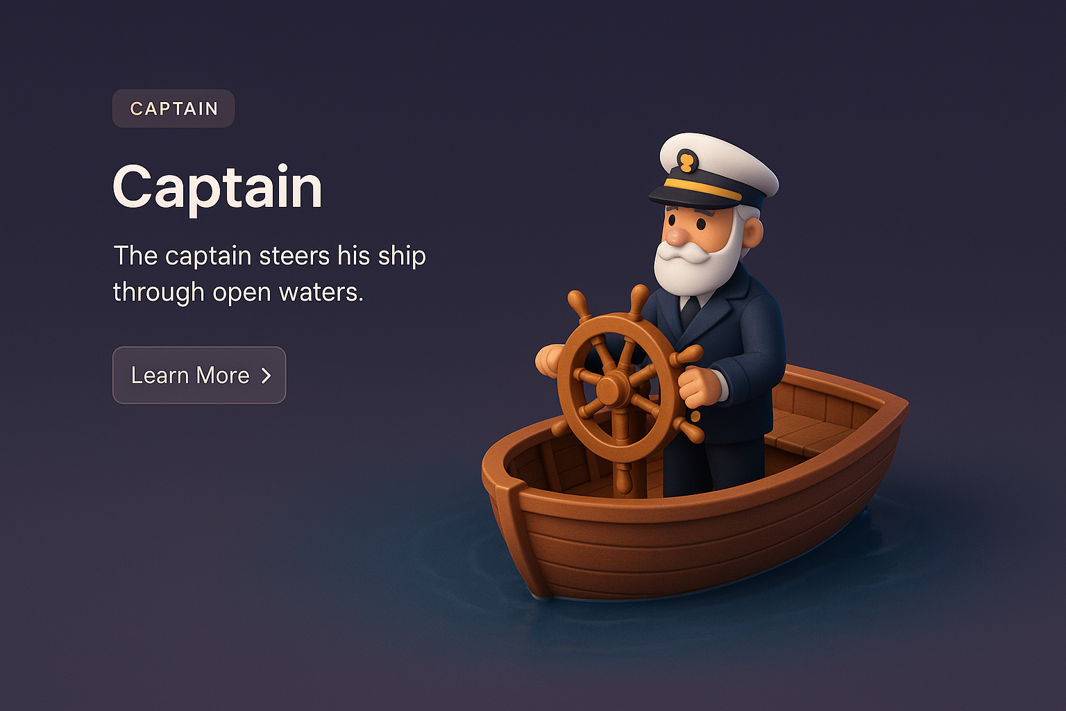 /Collection: /by davooda/Type: PNG/A 3D illustration of a captain steering a small boat, set against a dark gradient background. The scene features a well-defined foreground with text elements, creating a cohesive design.