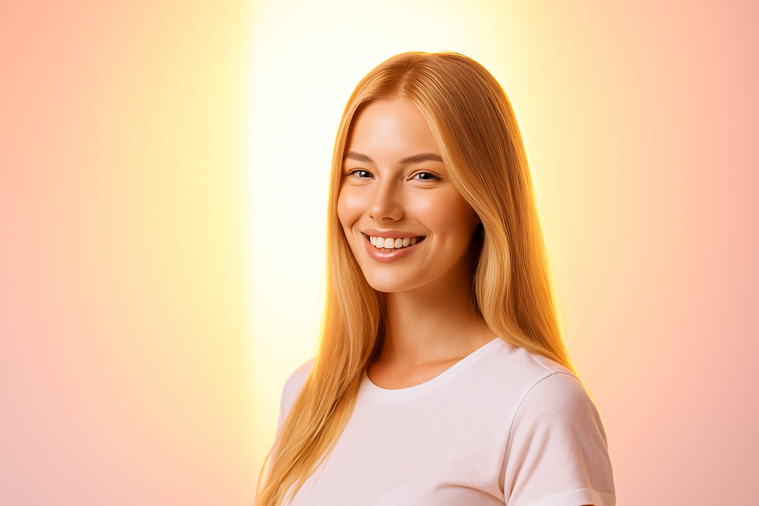 A smiling young woman showcases her long, well-groomed blonde hair against a soft pastel background. The scene is illuminated with backlight, creating a vibrant gradient effect.