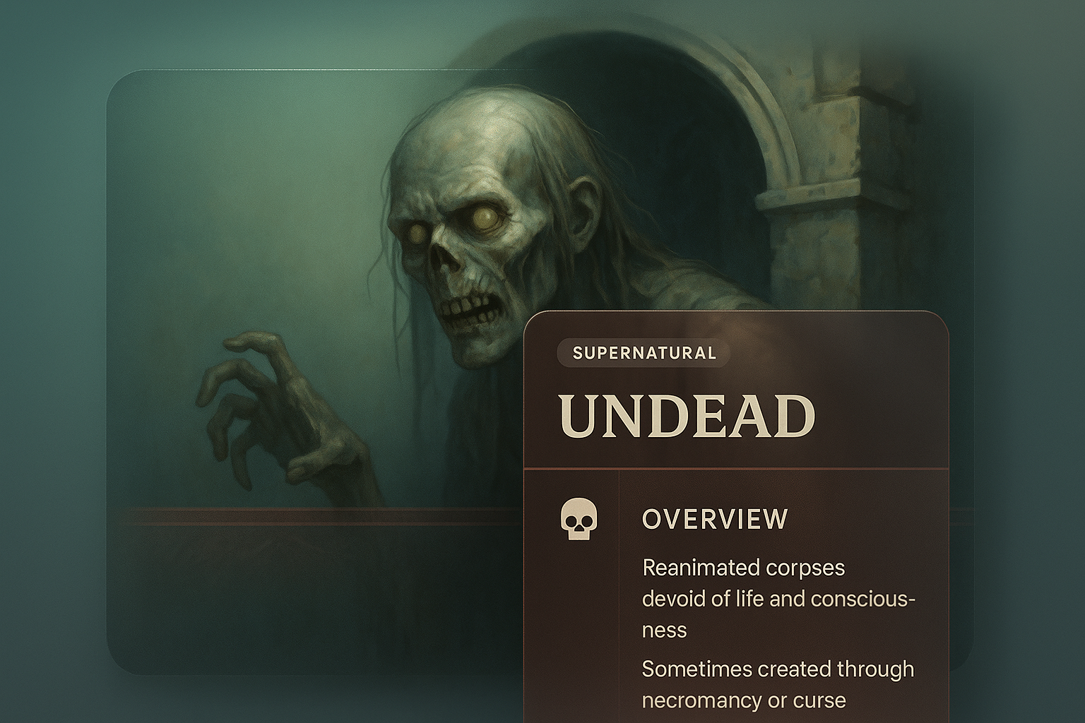 /Collection: /by davooda/Type: PNG/A captivating 3D illustration depicting an undead figure in a dimly lit environment. The design features integrated informational blocks with engaging patterns and readable text.