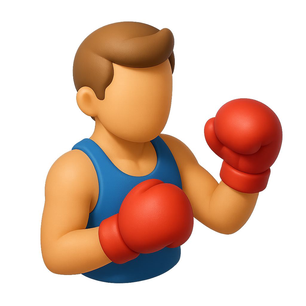 A stylized 3D icon of a boxer in a three-quarter view, featuring a muscular build, wearing a blue tank top, and red boxing gloves. The background is transparent.