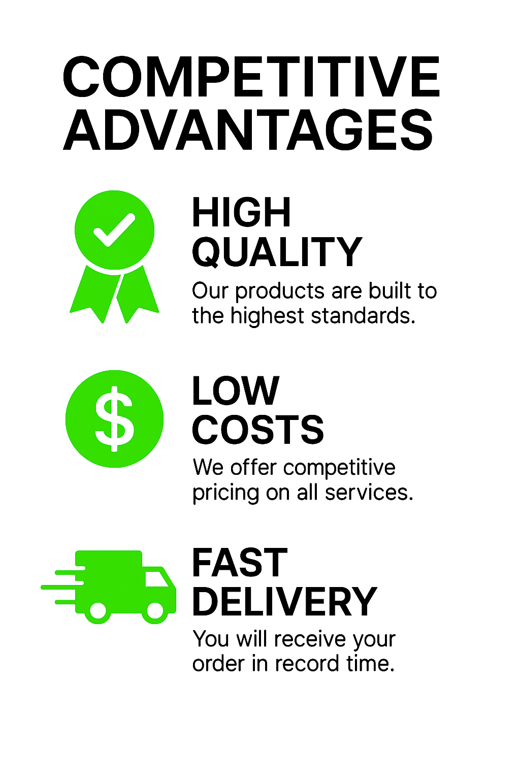 Informative graphic showcasing competitive advantages such as high quality, low costs, and fast delivery, designed for marketing and business communication.