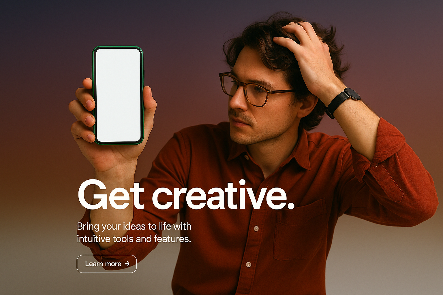 /Collection: /by davooda/Type: PNG/A designer poses creatively while holding a green phone. The background features a gradient from dark to light, enhancing the contemporary feel. Text elements urge creativity.