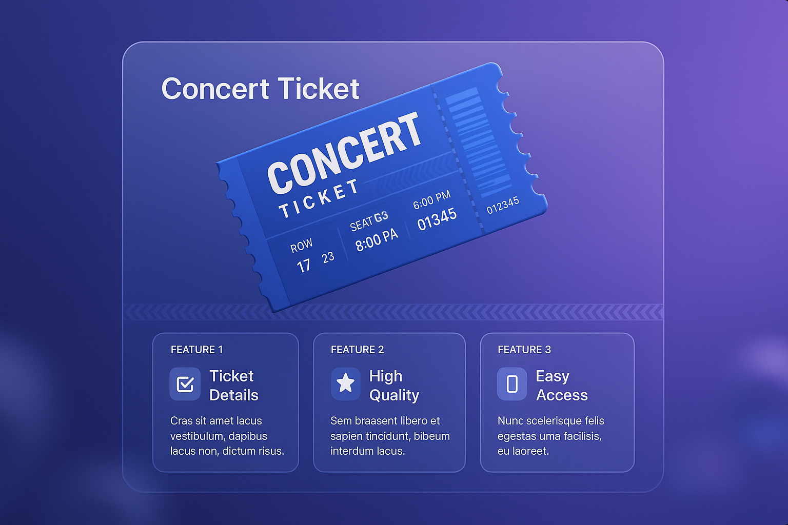 A visually striking 3D concert ticket against a smooth gradient background. The design highlights key features in a stylish layout, enhancing user engagement.