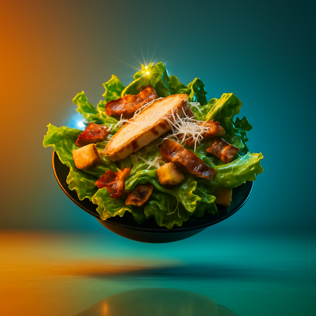 A visually striking Caesar salad, elegantly presented in mid-air with vibrant colors and backlighting. The salad features fresh greens, crispy bacon, and cheese, creating an enticing dish.