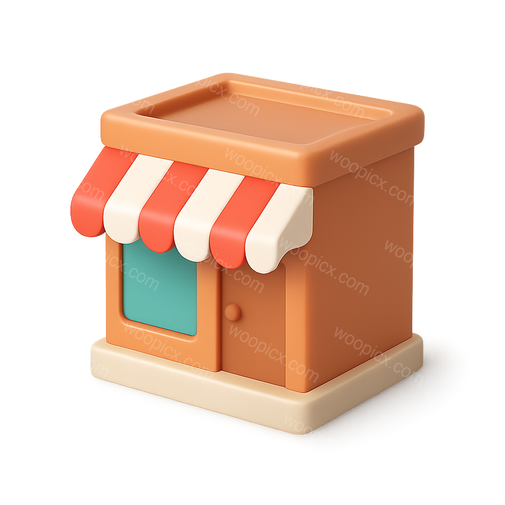 A charming 3D representation of a small storefront featuring a colorful striped awning, designed with a volumetric and isometric perspective on a transparent background.
